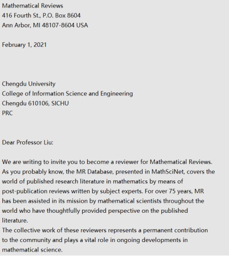 数学基础部刘茹老师收到美国《数学评论》(Mathematical Reviews)执行主编Edward G. Dunne的正式聘请信,应邀担任《数学评论》的评论员(评论员编号:155910)。这是Bwin足球