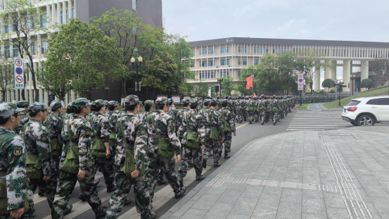 军训队伍第五营于4月12日下午三点时分进行了对分列式训练和匕首操训练的分流,军训场地由乐健山山下转移至青山田径场内。在转移过程中,第五营的军训学子们脚步整齐有序,随时能对教官的号令做出积极响应,显然已经充分进入了军训该有的状态。