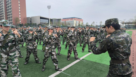 第五营到达青山田径场后,教官快速整队,并立刻开展了匕首操以及分列式的相关训练。整个过程中同学们对于新的军训知识十分感兴趣,教官也表现出了对同学们肯定,在教学过程中也采用了十分有趣的教学方法。在分列式的训练当中,同学们进行了踢正步的训练,由于是初次训练踢正步,教官目前只让同学们进行脚上的动作训练,手则放于腹前。在匕首操的训练当中,同学们先是学习了匕首操的起步动作格斗式,而后围在一块形成“授课队形”观摩学习前三步突刺动作。