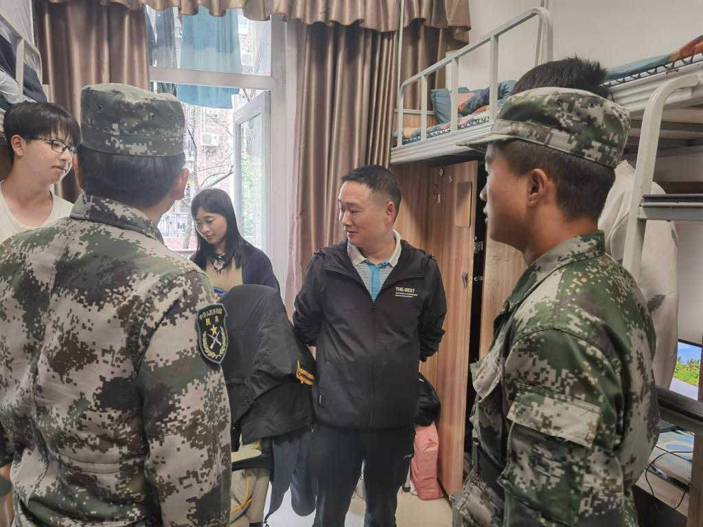 党委副书记孟源携全体辅导员来到学生宿舍15栋、16栋进行走访慰问,了解新生军训期间的内务事项,确保他们在恶劣的天气条件下依然能够保持良好的生活习惯和严谨的纪律性。