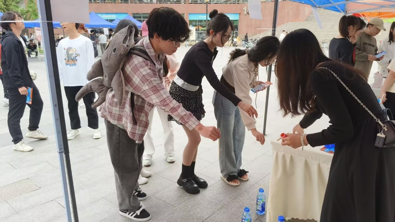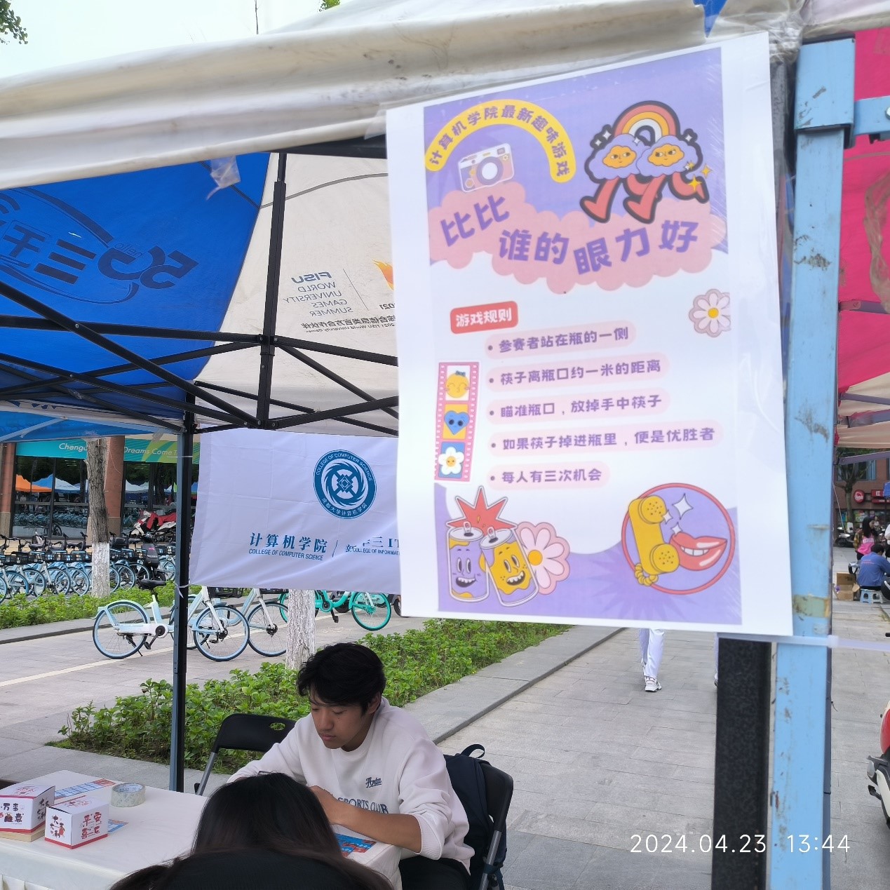 的小游戏“比比谁的眼力好”吸引了大批同学的注意。参赛者站在瓶的一侧,筷子离瓶口约一米的距离,瞄准瓶口,放掉手中的筷子,如果筷子掉进瓶里,便是优胜者。每人3次机会。每位参赛者拥有三次机会,这既增加了游戏的趣味性,也考验了参赛者的专注力、手眼协调能力和心理素质。不少同学表示,这样的游戏不仅有趣,还能在轻松愉快的氛围中锻炼自己的心理素质,是一种很好的放松方式。同时,同学们也深刻体会到了专注和耐心的重要性。在紧张的学习生活中,有助于同学们以更加积极、健康的心态面对学习和生活。此外,该游戏还促进了同学之间的交流与合作。在比赛过程中,同学们互相鼓励、交流技巧,增进了彼此之间的友谊与信任。