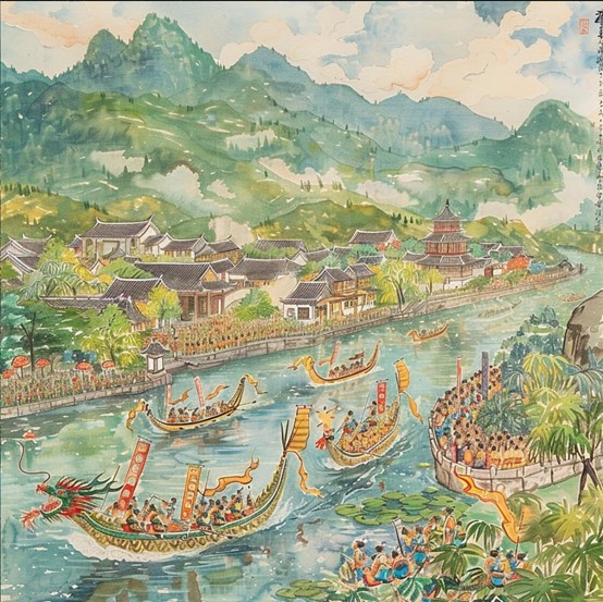学子利用人工智能技术创作的龙舟绘画作品,彰显了科技与传统文化的完美结合。