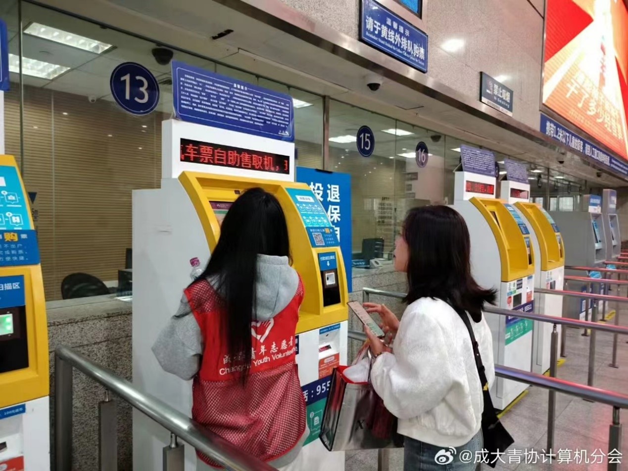 志愿者们满怀热情,在成都东客站志愿服务,在自助购票机前帮助有需求的人们买票、查票,协助安检进站,在大厅内做文明劝导员,在检票口维持秩序,帮助人们刷证进站并协助找到对应的车次,志愿者们在志愿活动中帮助他人的同时享受助人的喜悦与提升自我的幸福,志愿活动结束了,但志愿精神依旧在,志愿者们以后将继续在各个地方散发身上的光,共筑美好社会,志愿服务,我们在行动!