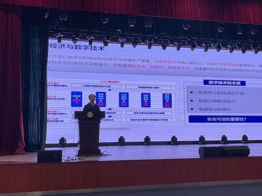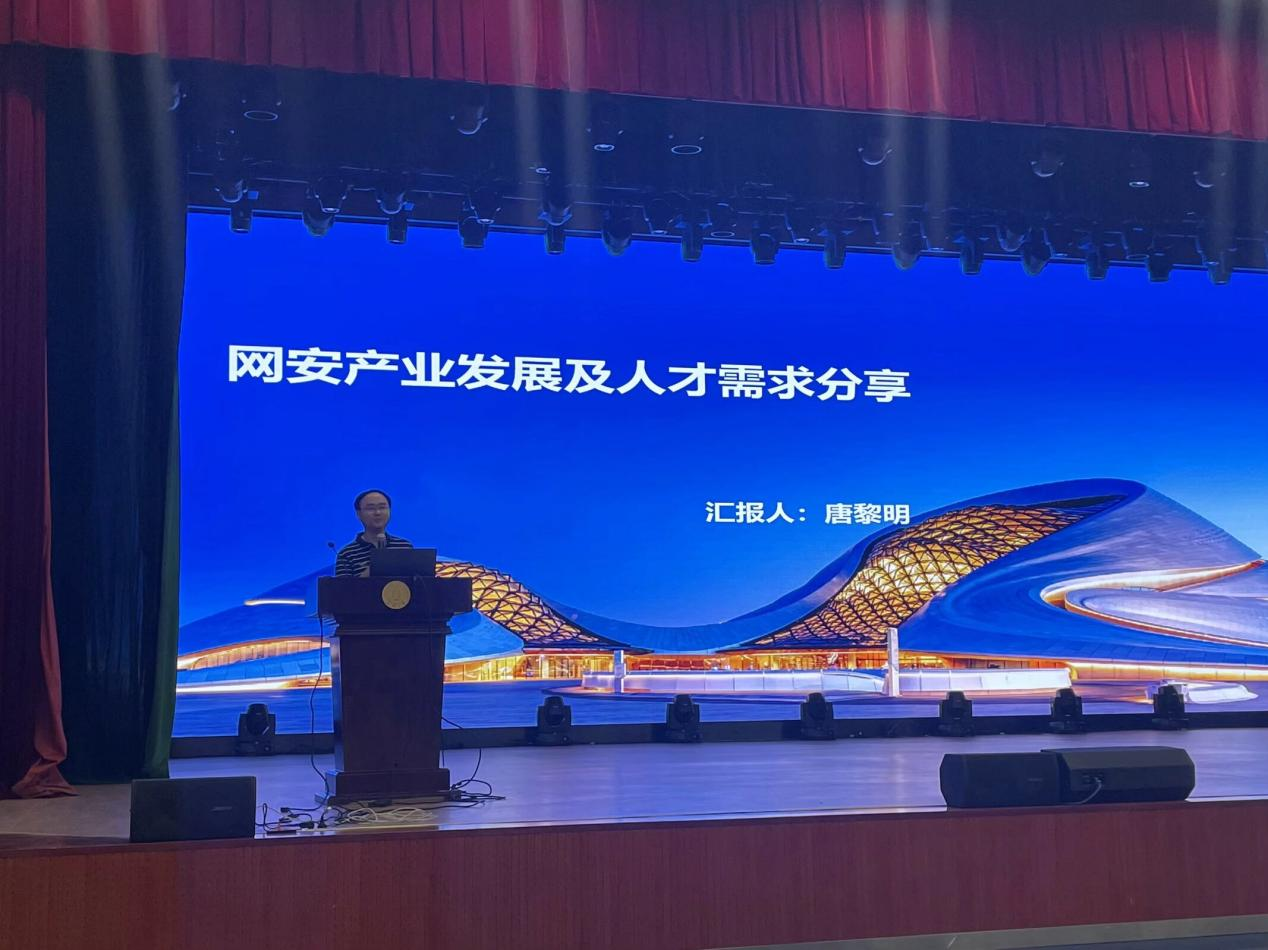 主讲人安恒信息数字人才创研院西部运营总监唐黎明从技术创新、人才培养、技术安全、未来发展等方面向同学们进行全面介绍。唐黎明首先强调了技术创新在当今数字时代的重要性。他指出,随着信息技术的飞速发展,各行各业都在经历着深刻的变革,而技术创新正是推动这些变革的核心动力。随后,他还深入探讨了人才培养的话题。他鼓励同学们要珍惜在校时光,积极参与各类实践活动和竞赛,不断提升自己的综合素质和竞争力。在技术安全方面,唐黎明强调了网络安全的重要性。他指出,随着互联网的普及和应用的深入,网络安全问题日益凸显,已经成为制约数字经济发展的重要因素之一。他呼吁同学们要树立正确的网络安全观念,掌握必要的网络安全知识和技能,为构建安全可信的数字环境贡献自己的力量。