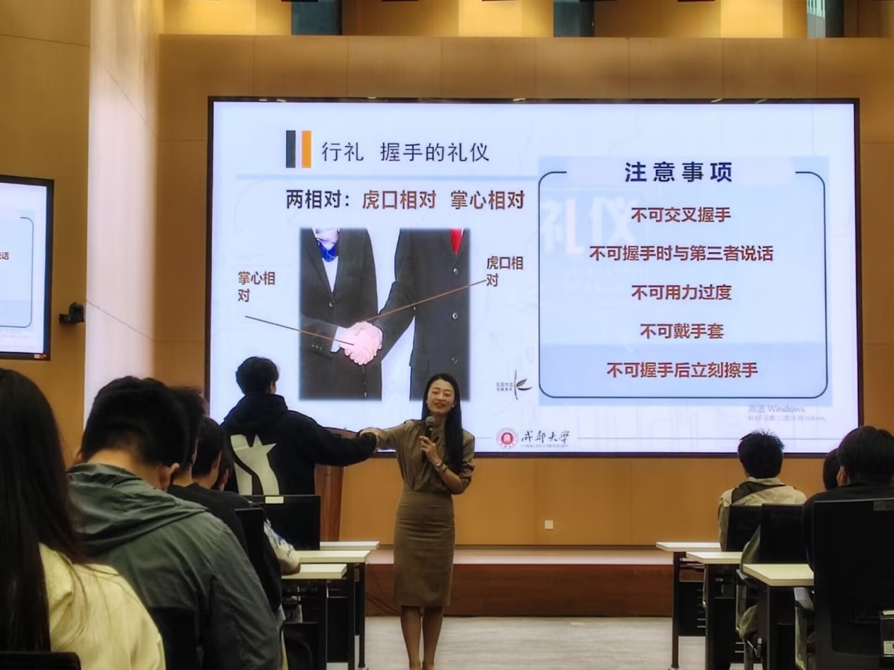 本场讲座内容涵盖了日常交往礼仪、课堂礼仪、公共场所礼仪等多个方面,详细讲解了正确的站姿、坐姿、握手礼等基本礼仪规范。她通过互动问答、情景模拟等多样化的方式,让学生们在轻松愉快的氛围中学习并实践文明礼仪,深刻体会到“不学礼,无以立也”的真谛。