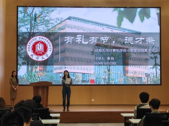 小星星计划进行了简要的介绍,希望学生骨干们通过此次培训,不仅在礼仪修养上得到升华,更能在沟通技巧上实现质的飞跃。随后秦晶深入浅出地讲解了文明素质的重要性和内涵,其中包含文明言行、礼貌待人等方面的知识。这些为同学们日后待人处事以及踏入职场提供了非常宝贵的经验。