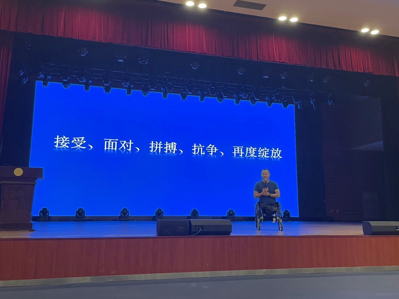 四川残疾人励志报告团成员代国宏、张琳馨、唐建先后进行宣讲,结合他们亲身经历讲述了自己身残志坚、拼搏向上的励志故事,展现了新时代残疾人自强不息、锐意进取的精神风貌。全国残运会游泳冠军、华中科技大学生命教育导师、成都市幸福国宏无障碍设施建设有限公司董事长代国宏,讲述了自己在5·12汶川特大地震中失去双腿的痛苦,他从废墟下对遇难同学的承诺和身边人的关爱鼓励中重拾信心,在教练指导下战胜失落与迷茫,通过刻苦训练登上冠军领奖台并获得“无腿蛙王”的美誉,用自己切身感受阐释了人生的真谛——“最好的告别”就是从伤痛中走出,勇敢向着积极健康的方向重新出发。