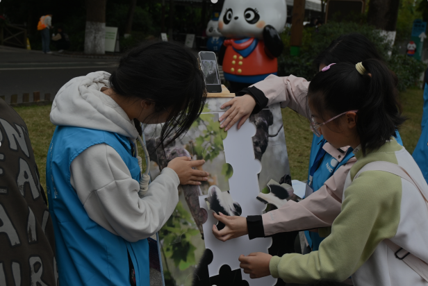 早上8:30,志愿者们便抵达了熊猫基地,他们穿着蓝色志愿者马甲,在熊猫基地博物馆前面摆起了一串活动点位,例如拼图活动,游客们通过自己上手不仅感受到拼图的乐趣,还可以观察熊猫图片了解有关于熊猫的一些知识,比如熊猫尾巴其实是白色的这种科普知识。
