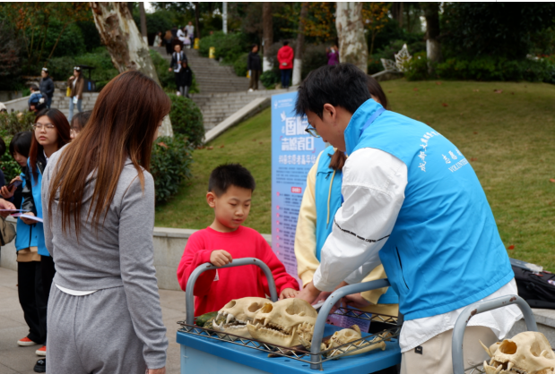 下午13:30,部分志愿者在博物馆门口摆设了讲解点位,其中有关于熊猫头骨、手骨、幼崽、粪便以及小熊猫头骨的讲解,游客们围为一圈听取志愿者的讲解,在玩乐的同时也摄取到平时不了解的有关熊猫的科普知识。