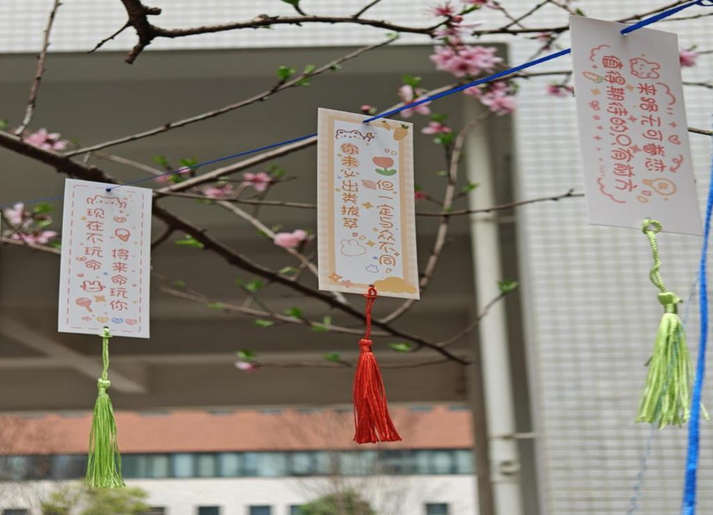 此次活动由计算机院学生会心生部精心策划,拍摄记录。活动现场,一棵棵树木挂满了五彩斑斓的书签,每个书签上都印有鼓舞人心、传递正能量的语句,如“每一天都是新的开始,珍惜当下,勇往直前”、“若结局非你所愿,就在尘埃落定前奋力一搏吧”等。同学们纷纷驻足观看,挑选自己喜爱的书签,用心品读上面的文字,感受那份来自心底的温暖。