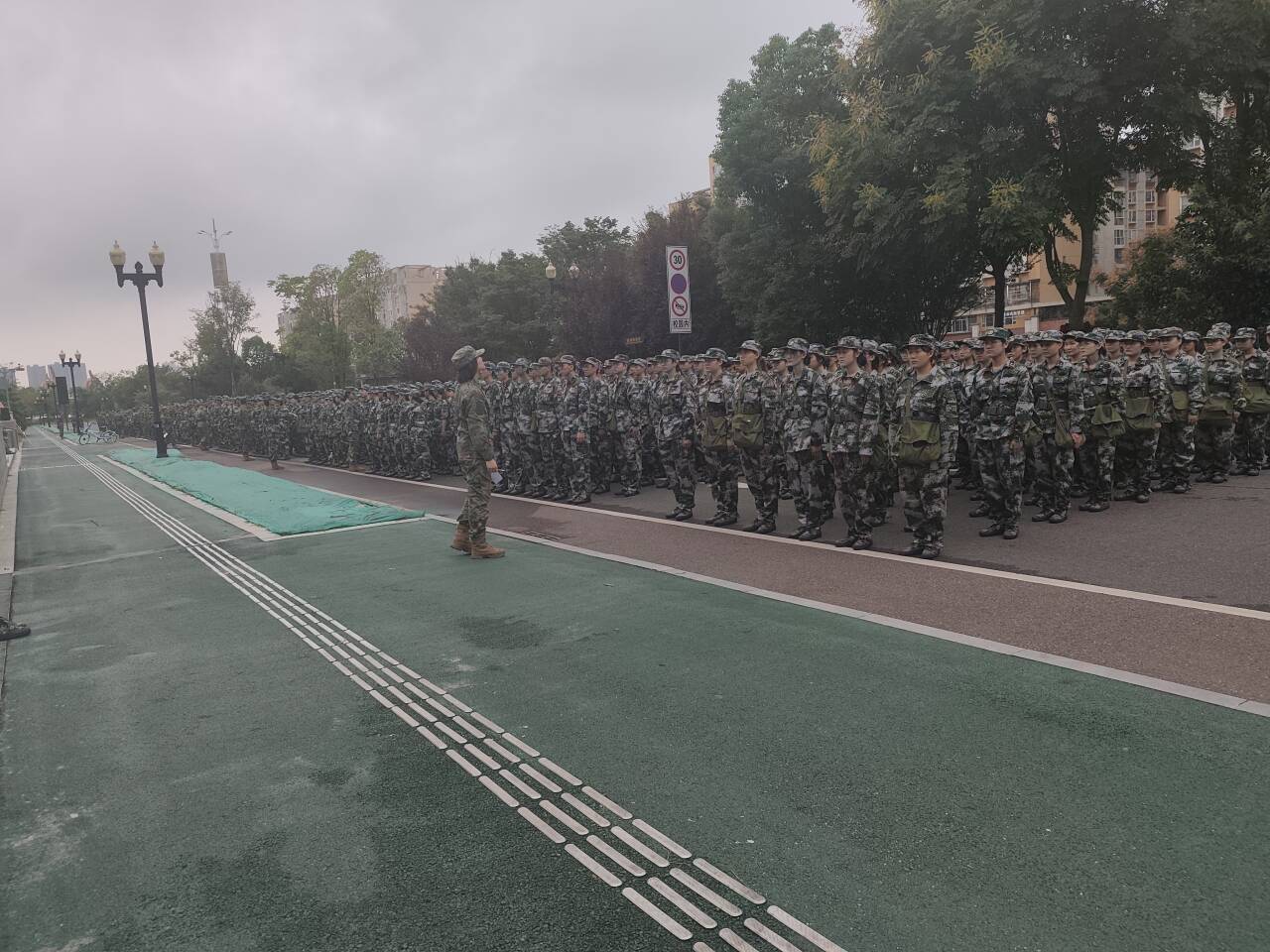 开训的第一天,虽然天气阴沉,却掩盖不住新生们心中的激情与斗志。汗水浸湿了衣衫,积水溅湿了鞋脚,但每一次整齐的口号声和有力的步伐,都在见证他们的成长与蜕变。