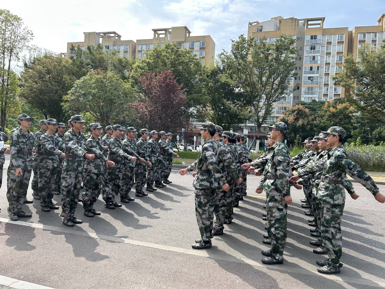检查结束后,新生们很快投入到常规训练中。稍息、立正、齐步走、正步走等科目不断重复,动作一遍遍得到修正,纪律意识在汗水与坚持中逐渐内化。烈日下,汗水顺着脸颊滑落,却无人退缩。同学们在坚持中磨炼意志,在反复中追求规范。教官们不时纠正细节,提醒队伍保持一致;而同学们则以“流汗不言苦、训练不掉队”的态度认真完成每一项任务。