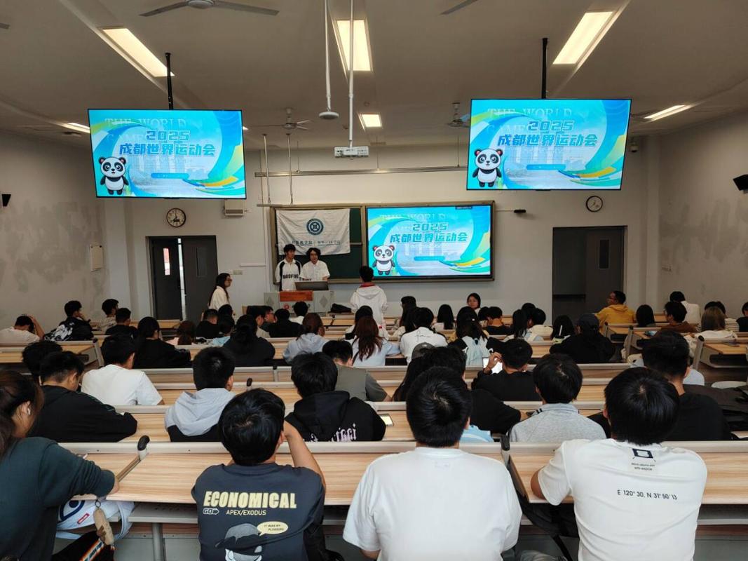 世运会志愿者周浩天、张子涵同学的理论宣讲拉开序幕。结合成都世运会赛事盛况,系统解读了“绿色、智慧、活力、共享”的办赛理念,深入阐释了运动健儿们展现的顽强拼搏、团结协作的体育精神,以及世运会作为文化交流平台对推动青年成长、促进国际友谊的重要意义。
