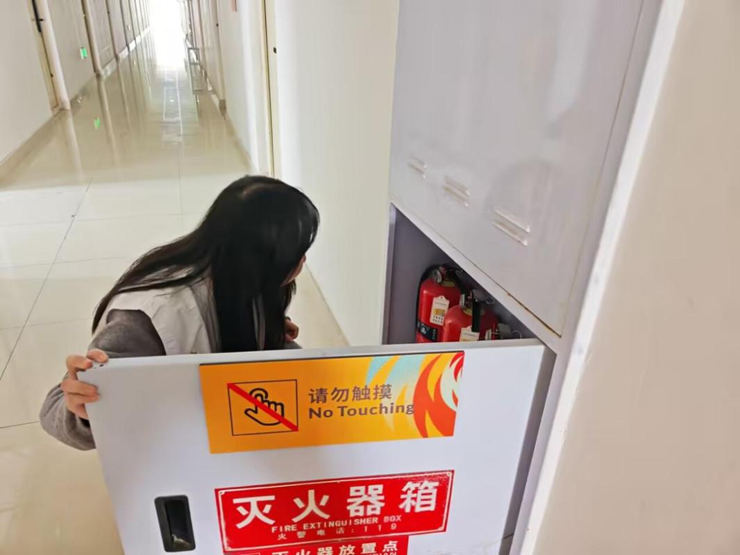 在公共区域安全巡检中,志愿者们重点检查消防设施设备状态,仔细查看灭火器箱等消防器材的完好情况,细致排查安全隐患,以严谨负责的态度守护校园公共安全,为营造平安和谐的校园环境贡献青春力量。