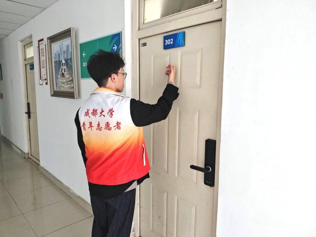 在学生宿舍区域,志愿者们主动走访,轻轻叩响宿舍门,提醒同学们及时清理楼道垃圾,爱护宿舍环境卫生,彰显了服务大众、爱护寝室的志愿初心。