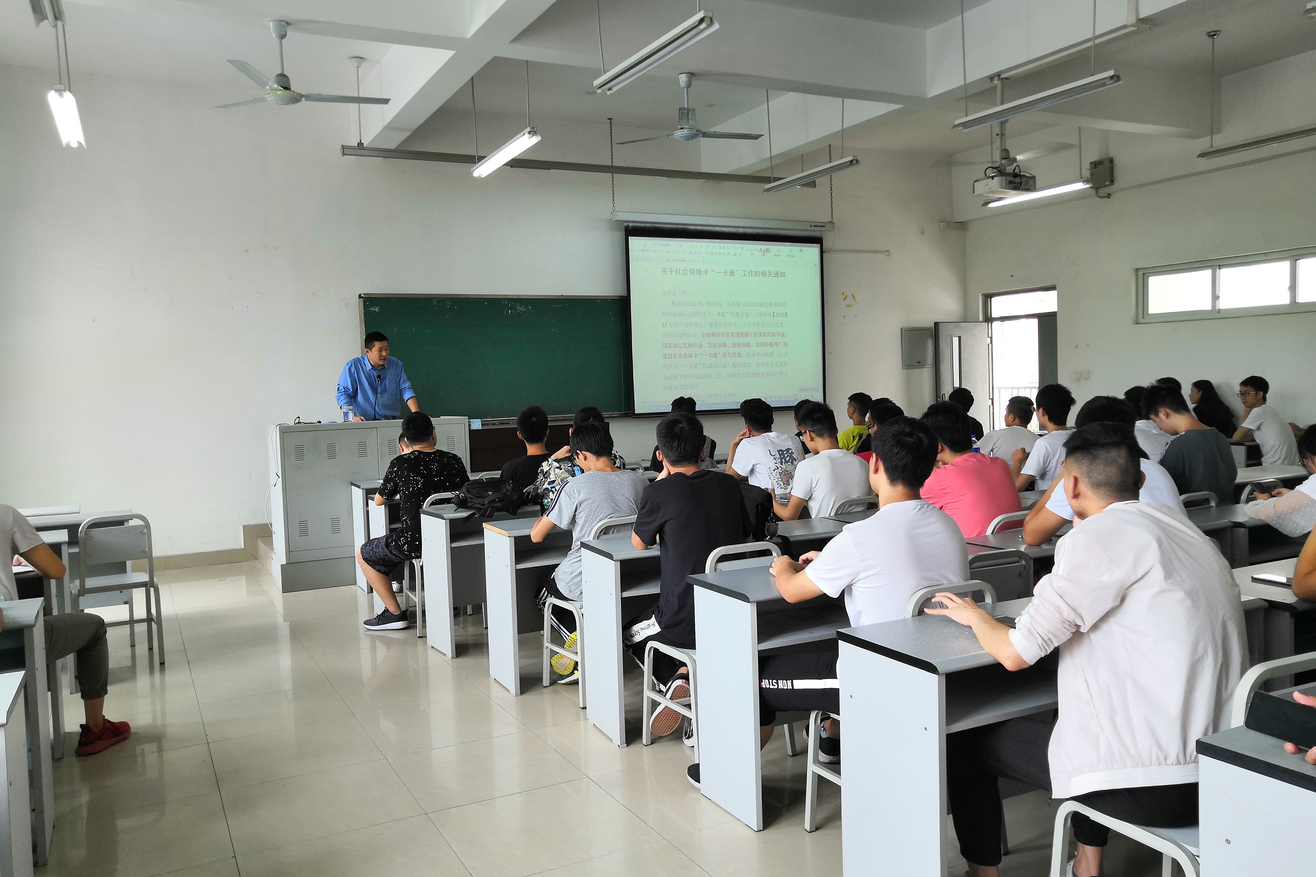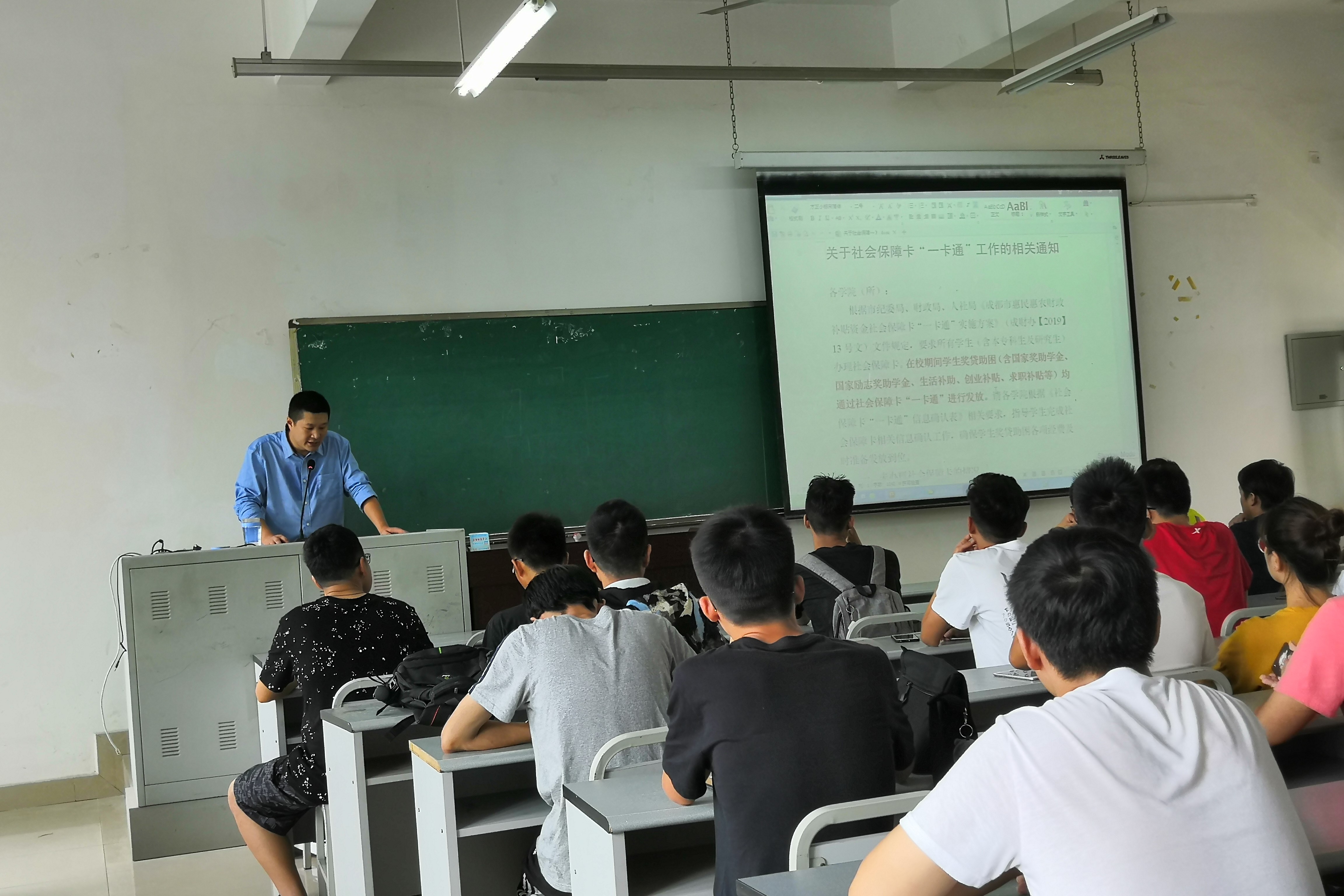 会议开始前,生活委员们有序签到进场。会议主要是根据市纪委局、财政局、人社局《成都市惠民惠农财政补贴资金社会保障卡“一卡通”实施方案》(成财办【2019】13号文)文件规定,传达所有学生(含本专科生及研究生)应办理社会保障卡一事。会议开始,陈东老师告诉大家:“在校期间学生奖贷助困(含国家奖助学金、国家励志奖助学金、生活补助、创业补贴、求职补贴等)均通过社会保障卡“一卡通”进行发放。”希望大家引起重视,同时陈东为大家分析了社保卡会出现的情况,例如:未办理社保可、办理但未激活、遗失等情况,并同时对症下药为大家分享了解决措施。陈东多次强调社保卡对大学生的重要性,随后生活部向生活委员发放了班级相应情况的表格与资料,要求生活委员核对信息。大家积极配合,认真记录会议内容。
