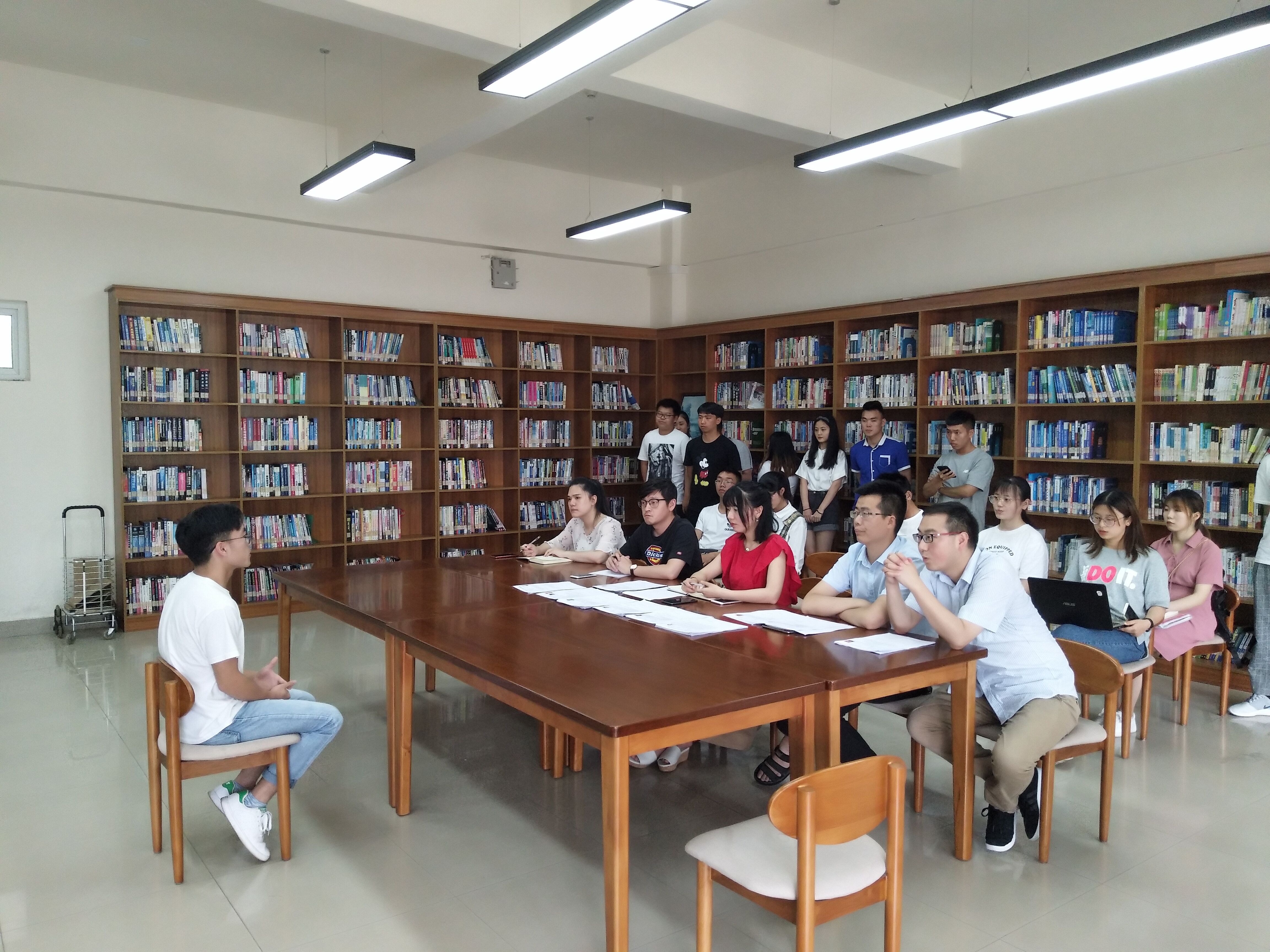 于10104举行了新生班主任助理选拔面试。19级新生班主任李钊、张亚飞、余小东,学工办方林红、敬晶、李轶、雍容担任本次面试的评委,来自17、18级的53名学生参加了面试。