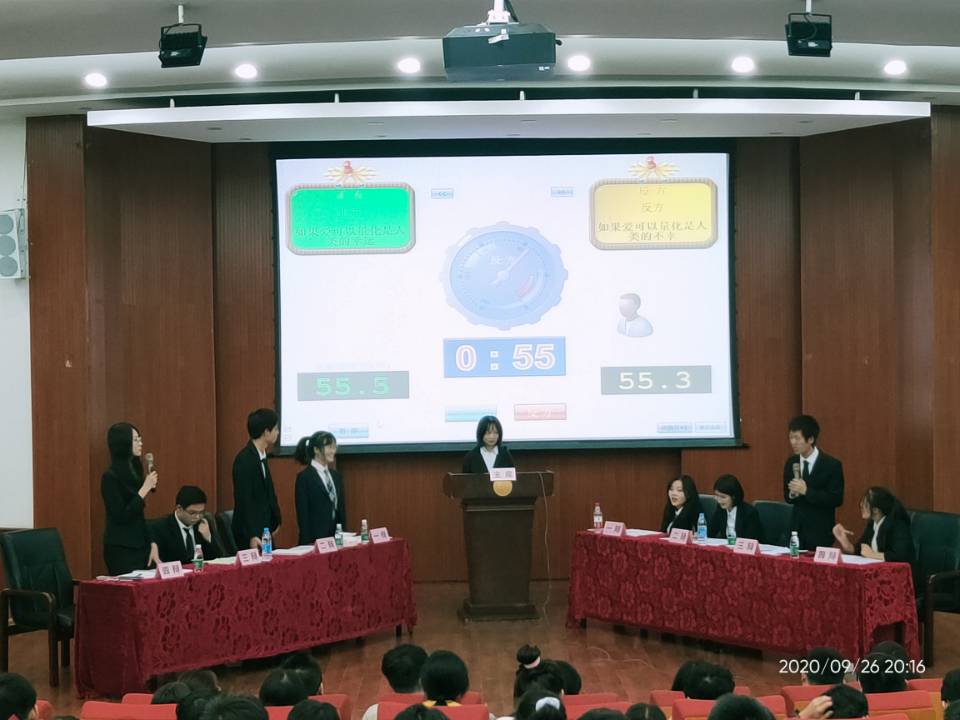 此次比赛采用世界华语辩论锦标赛赛制,正方观点为“如果爱可以量化,是人类的幸运”,反方观点为“如果爱可以量化,是人类的不幸”。比赛开始,正反双方一辩首先提出立论,随后正反双方二辩,针对对方一辩话语中的漏洞进行质询,将现场气氛推至高潮。紧接着,正反方三辩分别就对方二辩提出的驳论进行进一步地解释并对对方的观点再一次提出反驳,双方辩手逻辑清晰的思维一步步将现场气氛推向高潮,新生们反响热烈。当双方三辩进行小结后,进入到紧张的自由辩论时间,双方辩手发挥所长,展现出他们深厚的辩论功底。最后由双方四辩总结陈词,为此次表演赛划上圆满句号。