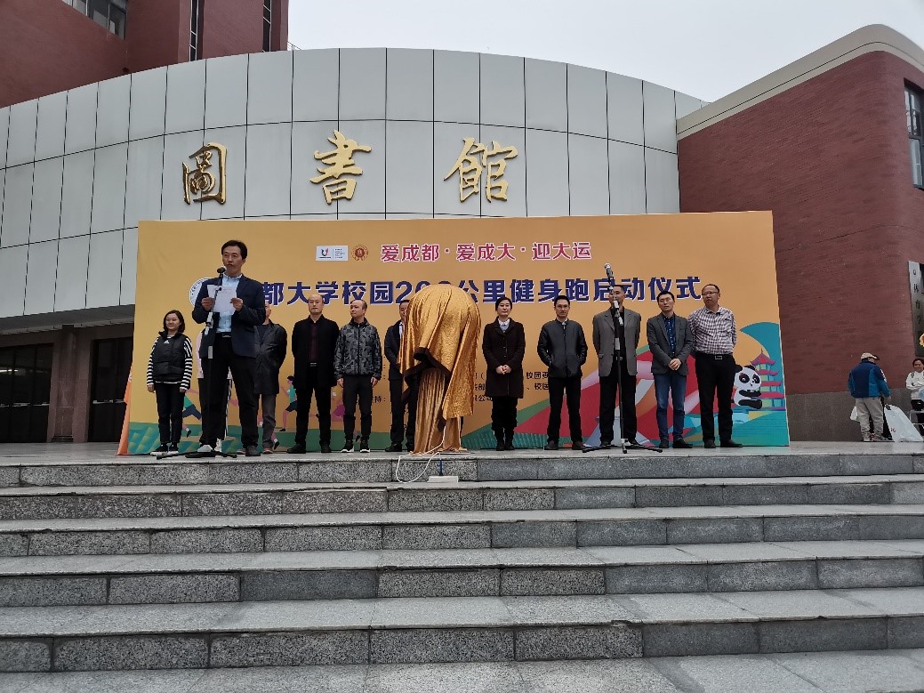 授旗,希望同学们能积极参加健身跑活动。紧接着,学生代表上台庄严宣誓。最后,在同学们的注视下,出席启动仪式的各领导共同按下水晶球,启动“成都大学校园200公里健身跑”。
