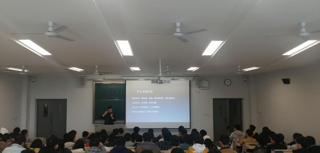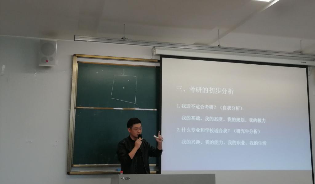 会议开始李轶老师从研究生的分类、考研的目的、以及对考研的初步分析等方面入手,进行了讲解,让同学们更加了解研究生的培养模式,并从考研的具体要求以及考研的具体安排等方面进行细化指导,让学生对考研有了大致的了解和安排。