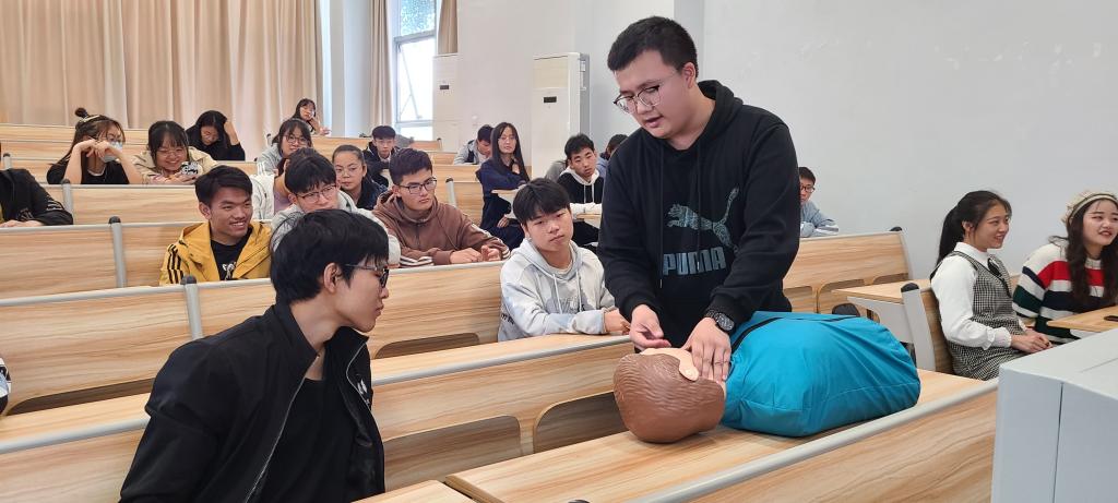最后,主讲人给同学们现场示范心肺复苏术的操作方法,利用医学模拟人进行讲解,并引导大家实际操作,对同学们在操作中不到位的地方进行指正,让同学们熟练掌握操作要领,并深刻认识到救护的重要性和必要性。