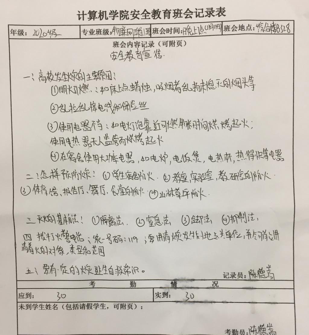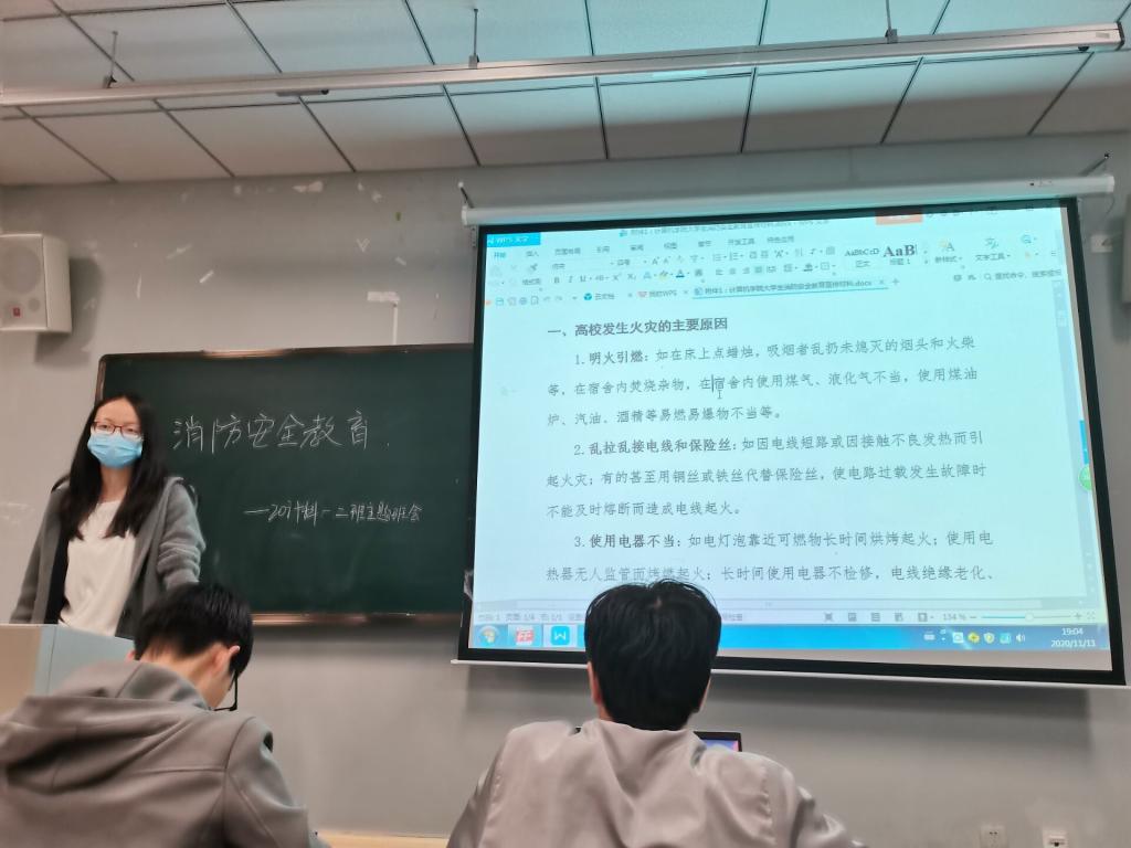 于2020年11月9日至30日期间针对2020级新生以班级为单位召开消防安全主题系列教育活动,活动由各班班主任、班助或班长主持,班级全体同学参与。