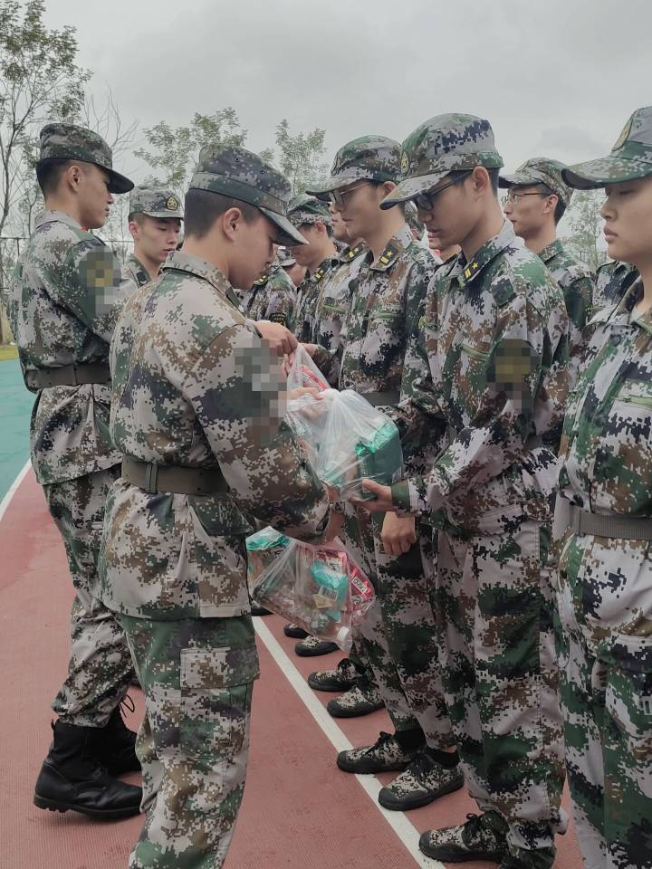 副书记孟源、学工办老师龚硕、李轶以及21级新生班主任来到三营十连训练地,看望正在军训的教官和学生。
