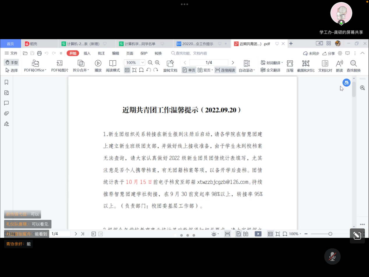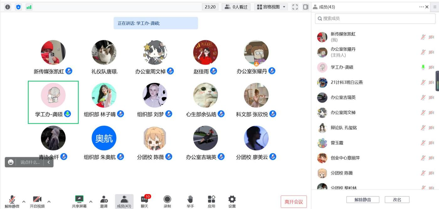 会议伊始,龚硕先对班委对接部门的方式与大家讨论得出了具体措施,关于素质拓展综测分的评定也细化了要求,进而对每个部门关于班委的考核提出了建议,希望大家指定考核细则,带动班委积极性并向新上任的新生班委提供方向。在新生即将开学这个时间点,各大部门的部长都应该做好自己部门的本职工作,并且做好迎新的计划与准备,把握住部门招新的机会发掘新生的特长与能力,为这届学生会开启一个新的篇章。最后,关于落实团组织转接和青年大学习这方面的相关工作,龚硕也提出了具体建议,并且对各部长的问题一一进行了解答。