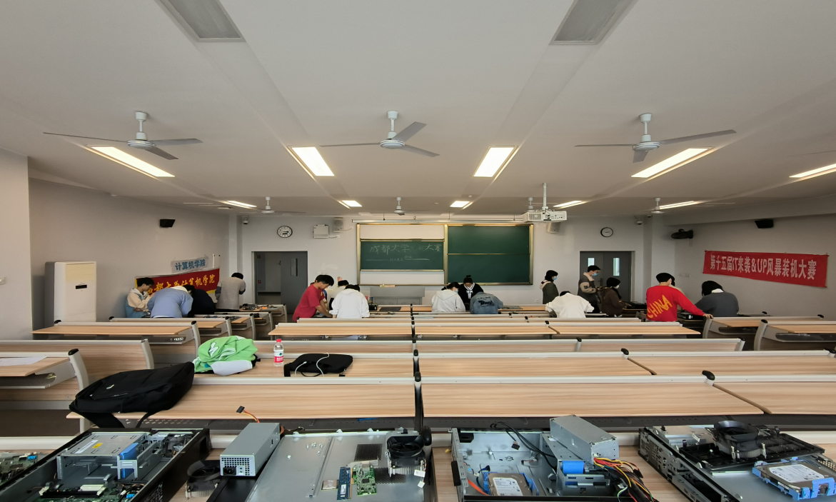 比赛开始前,科文部干事布置会场,并对主机进行调控。同时,也有不少同学提前到达比赛现场,他们首先根据签到表上的顺序进行分组,随后将对每组进行装机计时及评定。比赛正式开始,现场充斥着螺丝刀与零件碰撞发出的声响。每位同学都在争分夺秒地专注于眼前的主机复原工作,他们拿起面前的原件,认真还原每一个零件的位置。下午16时左右,比赛正式结束,结果待评定将在闭幕式前发布。