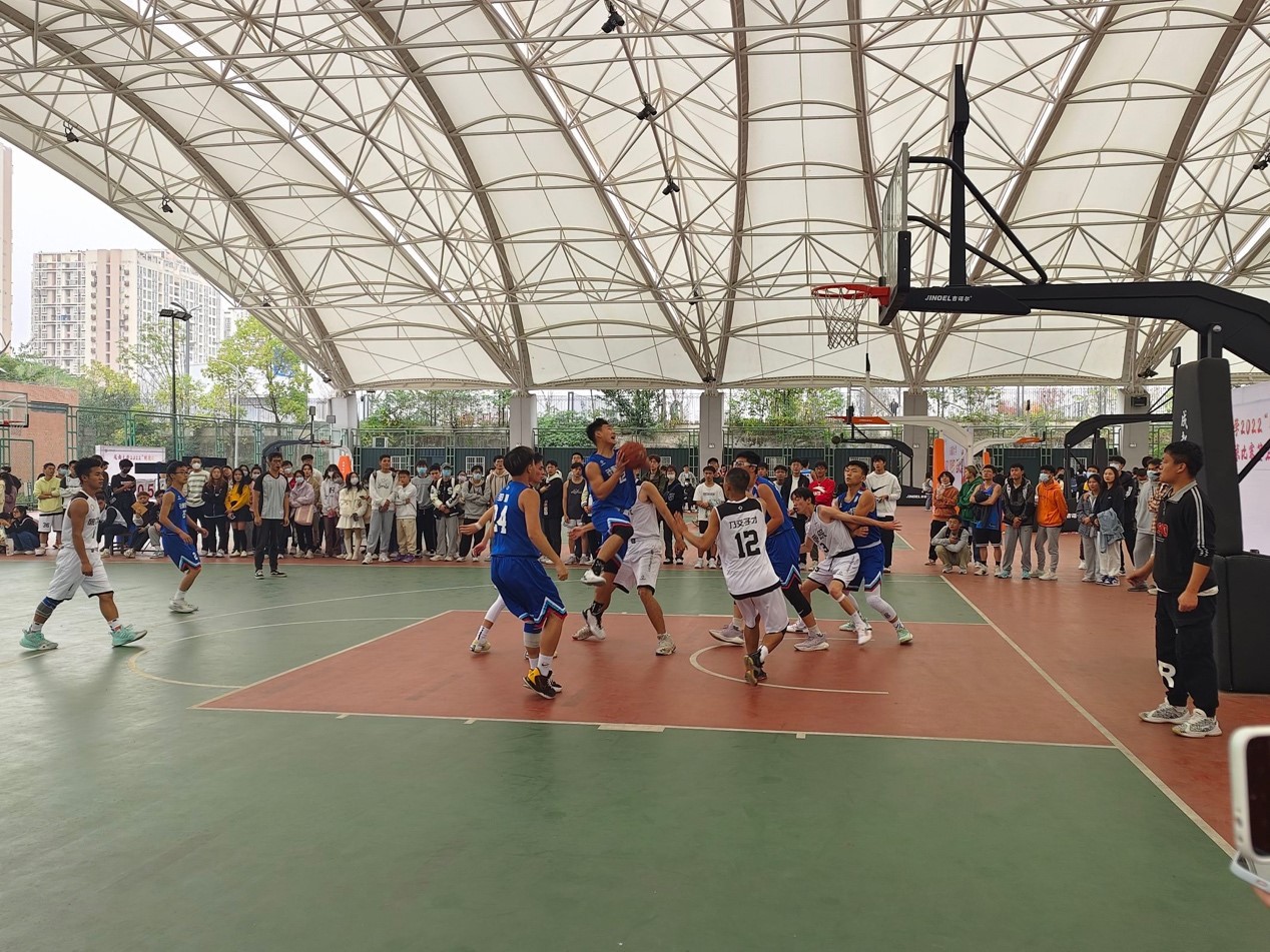 在风雨篮球场展开了第一场篮球赛。学工办老师饶涛莅临现场为球员们加油打气,本场比赛有50多位观众到场观看。