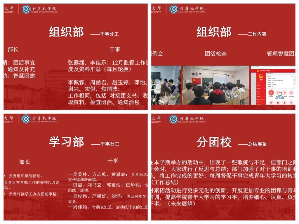 会议伊始,龚硕就本年度团学工作进行总结。主要围绕“学习党的二十大精神、深化青年思想引领”、“做好志愿服务、彰显青年担当”、“推动学生社团改革发展”以及“抓基层、重基础”四个方面进行全年团学工作总结。随后,分团委、学生会和艺术团各部门部长代表依次就本学期部门活动的开展情况、内部培训情况、新干事招新情况进行了汇报和复盘。会议中,主席团成员也针对各自分管的部门进行了工作点评和规划指导。