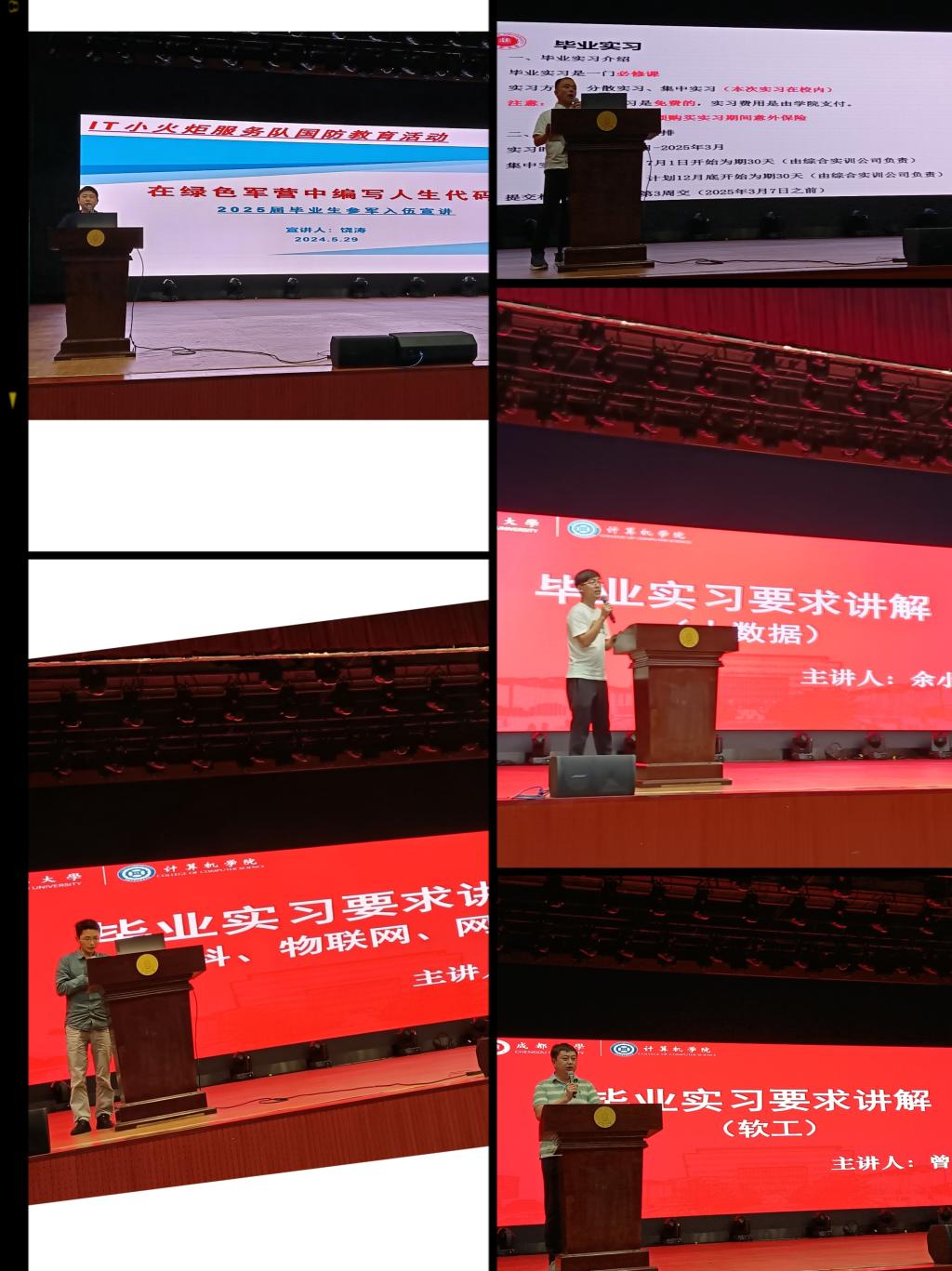 对实习的重视,提醒学生要遵守国家法律法规;遵守实习纪律、实习单位规章制度,合理规划时间,顺利完成实习报告的撰写。接着,各系部主任结合各专业特点,介绍当前就业市场的整体形势,指出计算机专业毕业生的就业前景广阔,但也存在竞争压力,并详细介绍了本专业的就业前景、实习机会和升学深造情况,鼓励毕业生根据自己的兴趣和专长,选择适合自己的发展方向,并提前做好充分准备。辅导员饶涛开展了征兵入伍宣讲动员,期望每一个热血青年都积极参与,将个人的锻炼和成长与祖国的发展紧密集合起来。最后,孟源强调了实习对于毕业生未来就业的重要性,建议同学们在实习期间认真学习、积累经验,提高自己的实践能力和综合素质,同时,提醒毕业生要认清形势、明确目标、早做准备,积极抢抓就业机会。