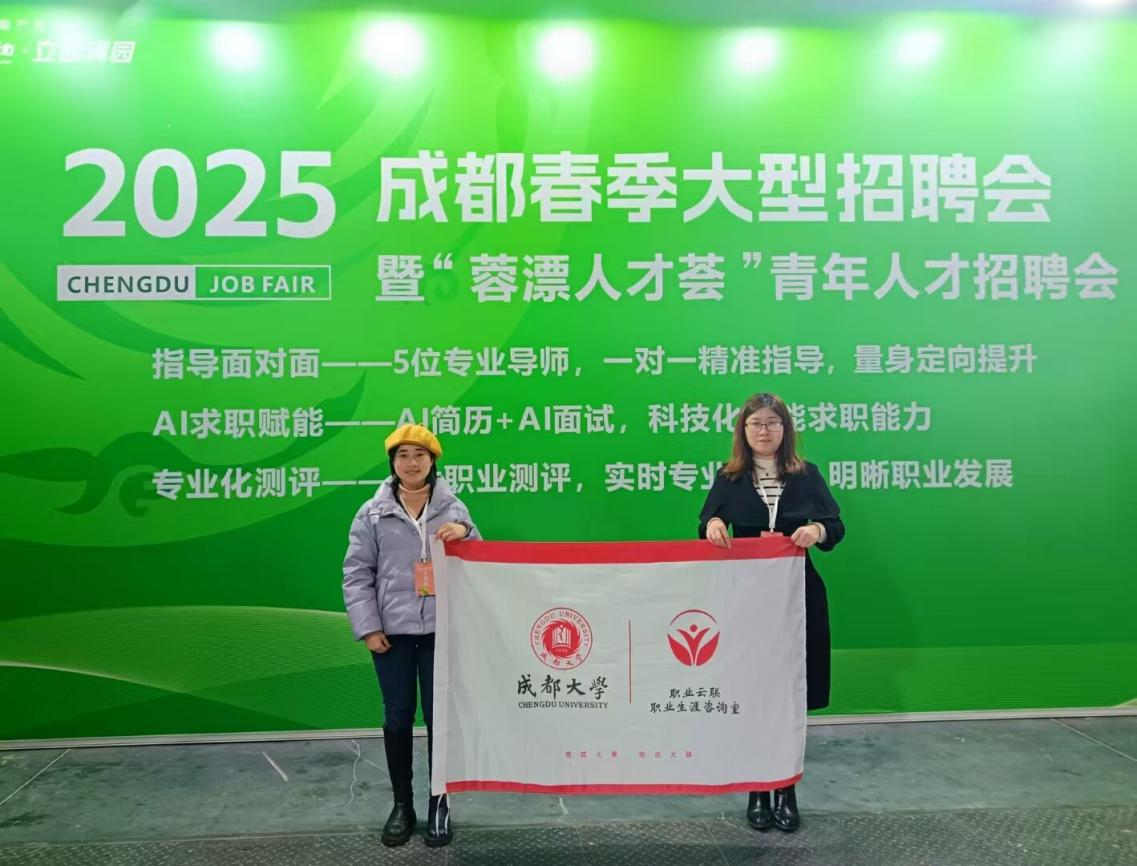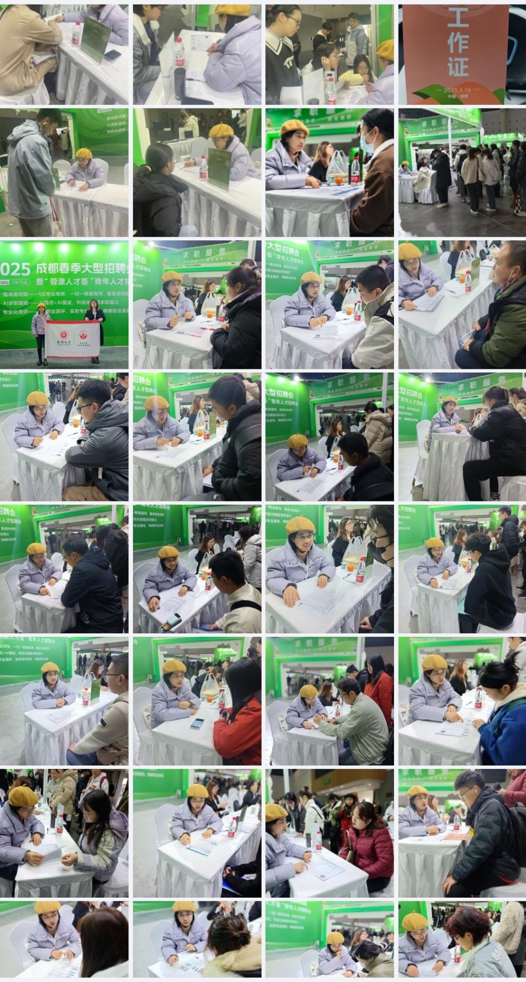 本网消息(文/罗宇辰 图/方红林)为助力成都市产业高质量发展,搭建人才与企业精准对接平台,由中共成都市委人才工作领导小组办公室、成都市人力资源和社会保障局主办,成都市就业服务管理局、成都市社会组织促进会承办的“2025成都春季大型人才招聘会”于3月16日隆重举行。本次招聘活动汇聚六百多家知名企业,提供近万个优质岗位,为求职者与用人单位搭建高效沟通桥梁。我校职业云联职业生涯咨询室优秀指导教师方林红、周婷参与活动,为90余位求职者提供简历指导、生涯规划等,好评率达到98%以上。