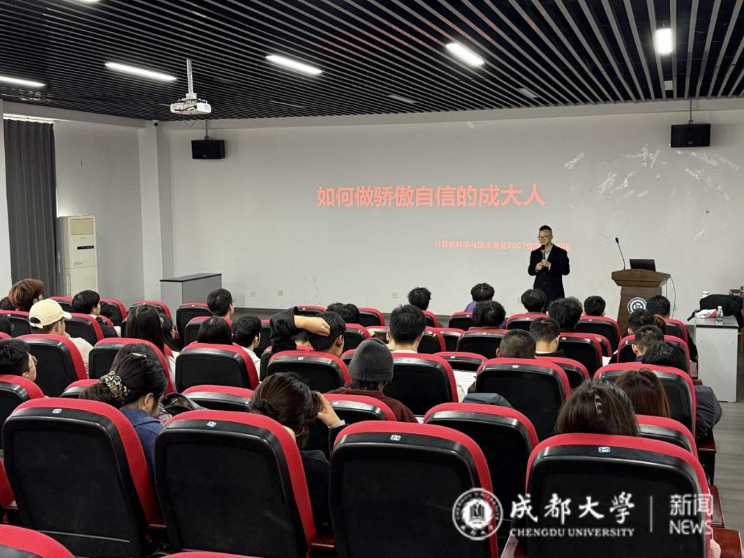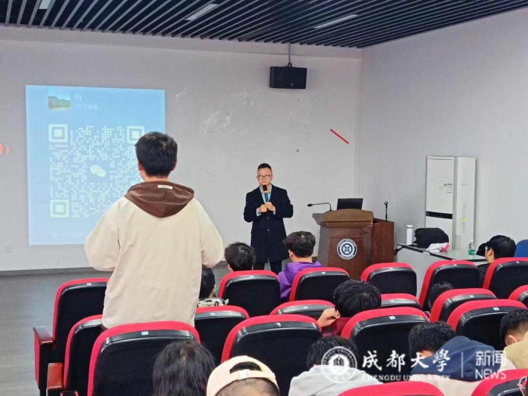 刘强老师作为成都市优秀青年教师、成都市人工智能教育学会理事、四川省计算机学会理事、四川省信息学竞赛委员会委员、中国人工智能学会中小学专委会委员、教育部教育技术资源管理中心人工智能教育培训师、工信部人工智能+行业创新应用大赛青少年教育工作委员会主任、AIED人工智能国际教育大会PC委员会委员,长期从事信息学奥赛与人工智能教学,拥有丰富的教育经验,致力于探索科技教育与学生成长的深度融合。讲座中,他以教育实践与个人成长经历为切入点,围绕“自信”“成长”“成大人”等关键词展开分享。通过生动的案例与深入浅出的讲解,他引导学生思考如何在大学阶段找到自我定位、塑造自信人格,并在学习与生活中不断积蓄力量。同时结合人工智能教育的前沿视角,鼓励同学们在时代变革中保持好奇与探索精神,以成长型思维积极应对未来的挑战。