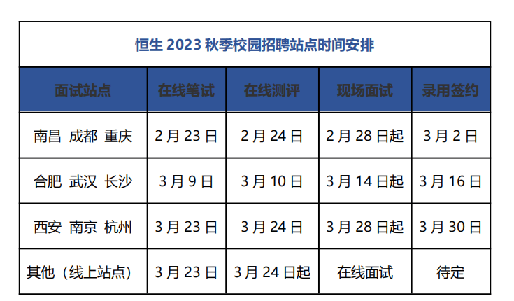 恒生 2023 秋季校园招聘站点时间安排