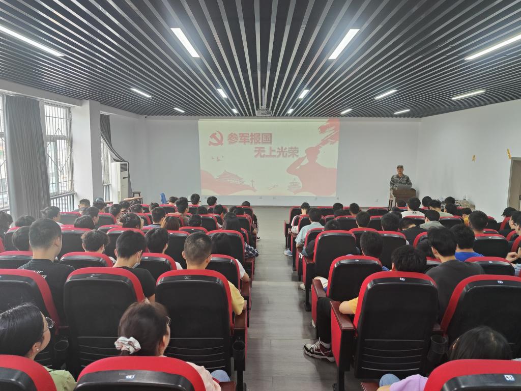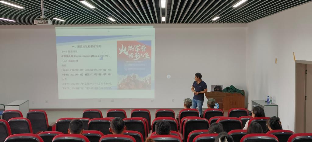 饶涛就参军入伍相关事宜进行宣讲。饶涛围绕报名地址和报名时间、报名要求和注意事项、在部队选拔培养政策、升学优惠政策、退役后就业服务政策等方面进行宣讲,希望符合条件的同学踊跃报名,投身军营。