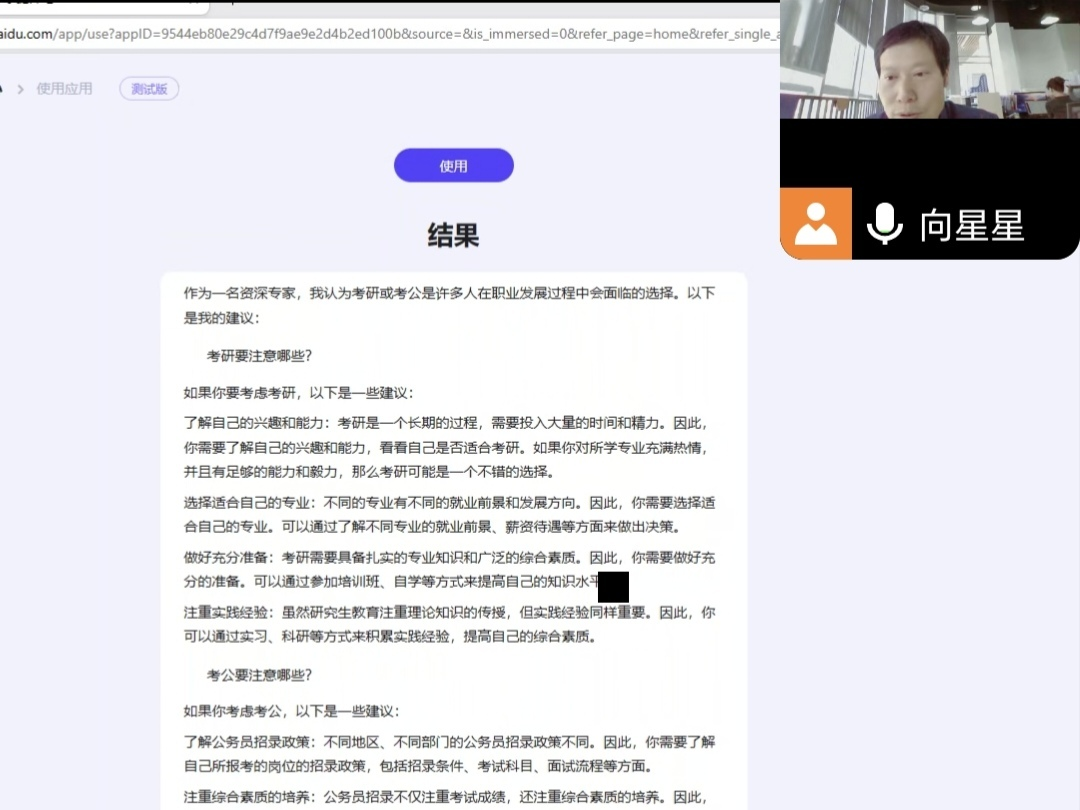 活动伊始,向星星老师介绍活动主题和目标,激发各位同学们的兴趣。紧接着,他对AI技术进行了详细的概述,包括AI技术的基本概念、发展现状和应用领域,让各位同学对AI有了基本的了解。接下来,他谈及AI在职业规划中的应用。就“如何利用AI技术来规划个人职业发展”这一话题与同学们展开深入探讨,并利用AI技术分析兴趣、优势、能力以及如何选择适合自己的职业方向等等。