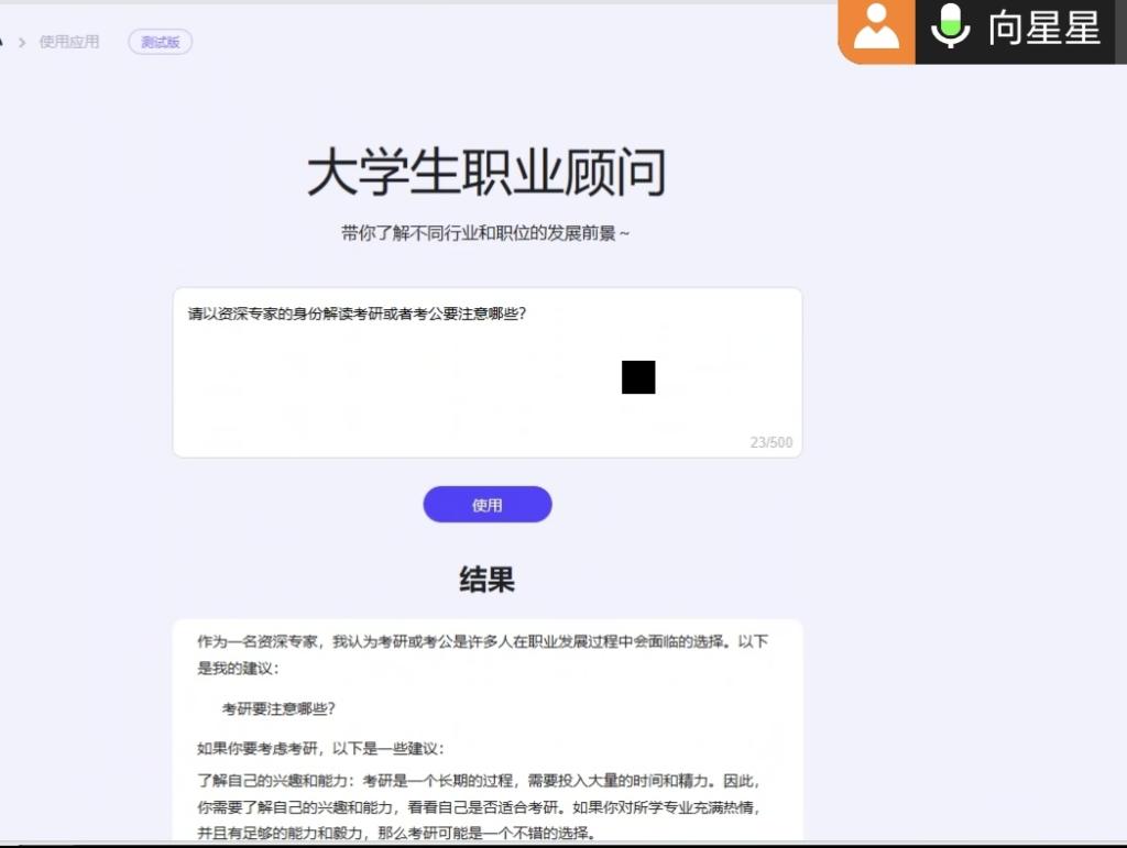 除此之外,向星星与同学们还探讨了“挑战与应对”的问题。其中包含AI技术对职业规划带来的挑战:例如职业消失风险等。并为同学们提供应对策略和建议,如持续学习和提升自己的技能,适应就业市场的变化。期间,向星星老师不断分享他的经验和见解,以启发各位同学对AI与职业规划的深入思考。