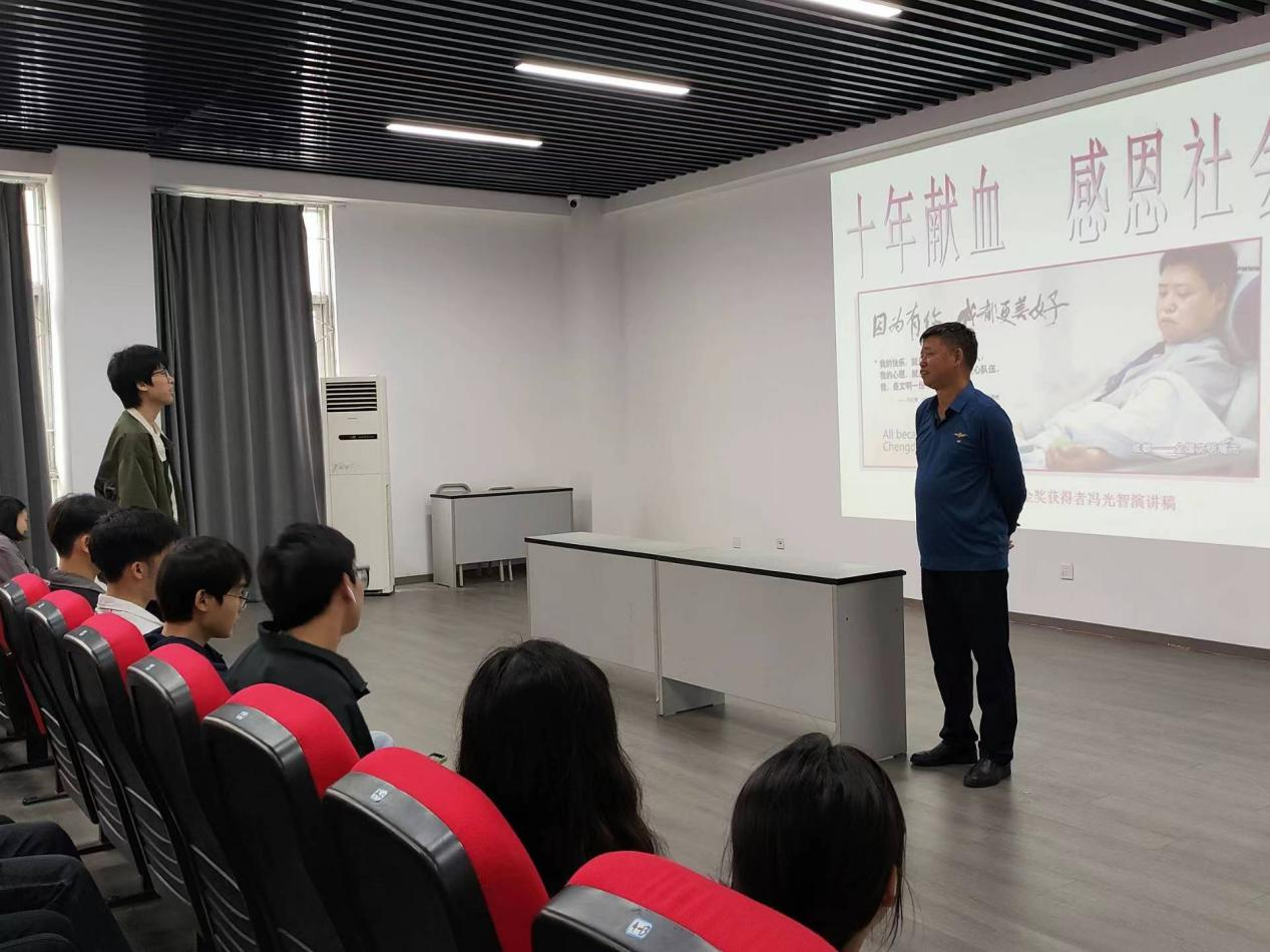 冯光智在本次宣讲会上围绕互助、感恩、奉献开展主题讲座。活动伊始,冯光智提出献血相关问题并与同学展开互动,了解大家对献血的认知,在此基础上冯光智向大家普及了献血相关知识,让大家了解献血并且打消顾虑。紧接着,冯光智举例说明这是一个互助的社会,强调我们在享受这一切的同时,应当怀着一颗感恩的心。最后,冯光智表示加入无偿献血宣传志愿服务队不仅是为家人、为他人、为社会付出一片爱心,也是一种幸福的收获。