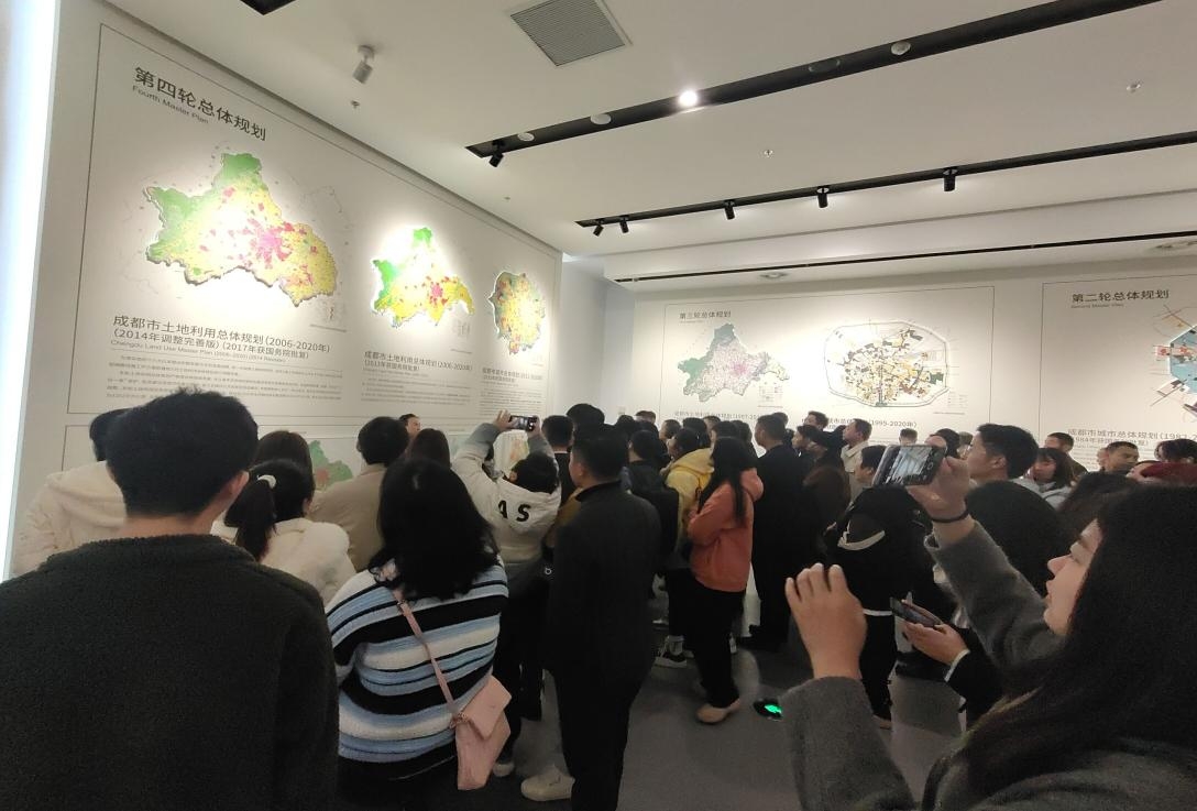 活动伊始,讲解员带领大家进行参观,在城市历史厅,从古蜀文明到近代,成都的变迁历程尽收眼底;而战略定位和战略目标厅内,则总体介绍了“国家中心城市、美丽宜居公园城市、国际门户枢纽城市、世界文化名城”的内涵、特征及发展策略;三楼,庞大的全域实体模型展示使得同学们不时发出惊呼,实体模型、舞台灯光与LED大屏三位一体,联动展示成都从“两山夹一城”到“一山连两翼”的城市空间格局转变、“一心、两翼、三轴、多中心”的市域空间结构等规划信息;而在以“乡村振兴”为主题的展示空间,同学们则感受到了“林在院中、院在林中”的林盘意境空间。在参观过程中,讲解员详细介绍了成都市规划馆的运作模式和业务领域,解释相关国家政策,同学们兴趣盎然,积极与他们进行交流互动。此次成都规划馆参观活动不仅让同学们了解到成都这几十年来规划发展的情况,也见证了成都逐步走向城市发展前沿的过程,感受到改革开放以来成都的巨大变化和未来的发展前景,设身处地地感受到了城市发展、国家发展政策和城市发展战略等带来的好处。