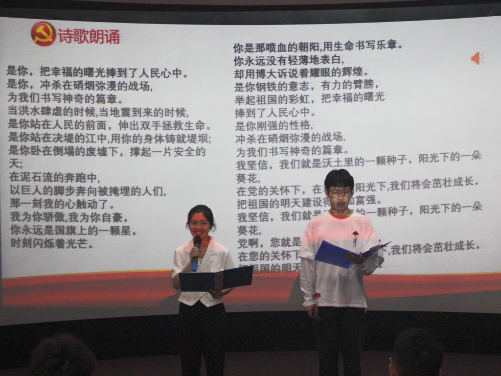 班会伊始,通过观看视频《建党百年》,回顾了中国共产党发展的光荣历程。一百年来,中国共产党始终以坚定的信念、顽强的意志,在中国革命、建设、改革的伟大实践中坚持探索初心和使命。同学们深刻认识到今天幸福生活的来之不易,也深刻理解到中国共产党成为中国革命的领导者是历史的选择。随后,周珂永和杨万英同学以《歌颂党》为题进行了诗歌朗诵,抒发了同学们热爱党、热爱祖国的真情实感,也充分展现了Bwin体育