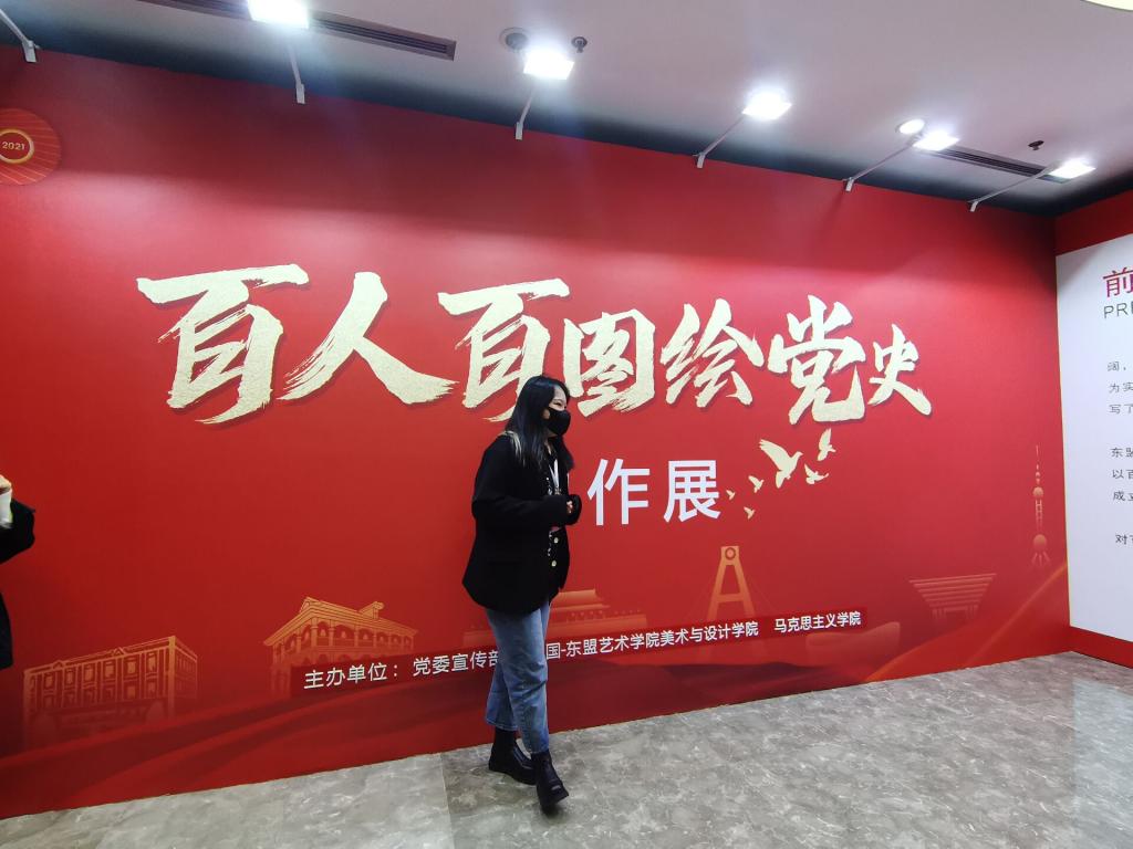 活动开始,龚雨逍带领全体同学参加展览。她介绍“百人百图绘党史创作展”作品是以党的发展历程为线索,以重要人物和事件为内容,以绘画、书法、设计为载体,表达了师生们对百年党史的铭记和对党的恩情,以此献礼中国共产党百年华诞。