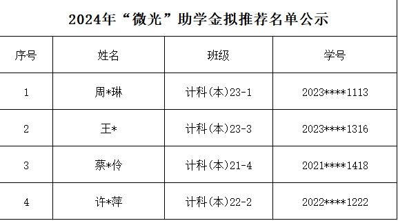 根据《Bwin体育 2024年“微光”助学金评选通知》有关条件、政策等评选细则,在公平、公正、公开的原则下,拟推荐周*琳等4位同学为2024年“微光”助学金拟获得者,详细名单见下表。