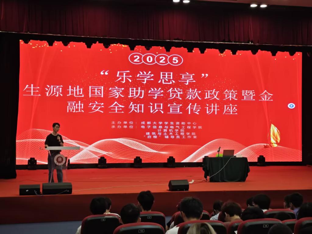 及“启橙”辅导员工作室承办的2025“乐学思享”生源地国家助学贷款政策暨金融安全知识宣传讲座在学活103演播厅顺利举行。讲座聚焦生源地助学贷款介绍与反诈宣传两大核心内容,吸引140多名学生到场参与。