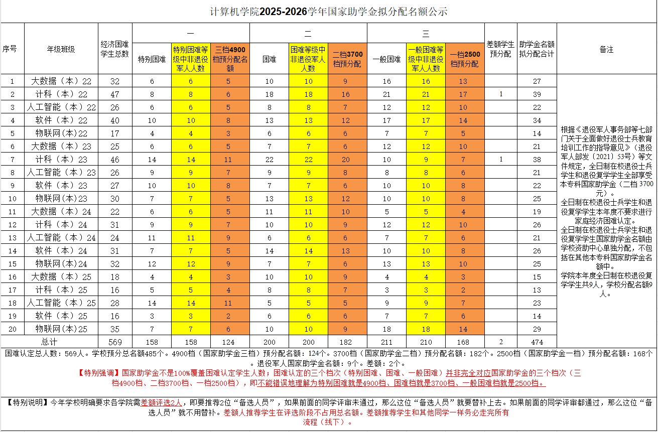 根据《成都大学关于做好2025年普通高等学校本专科生国家奖助学金评审工作的通知》相关要求,Bwin体育 2025-2026学年国家助学金名额拟分配方案如下,共485名(含差额2名、退役复学学生名额9名,本专科生474名)。