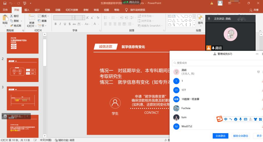 会上,龚硕从贷款政策、诚信还款、征信常识三个方面的注意事项向同学们详细讲解了当前的生源地助学贷款政策。着重讲解了毕业生办理毕业确认、就业信息更改等事项的详细步骤。最后特别提醒所有办理了生源地助学贷款的毕业生及时登录ISP系统,确认并在线签署还款承诺书,并且按时偿还贷款。