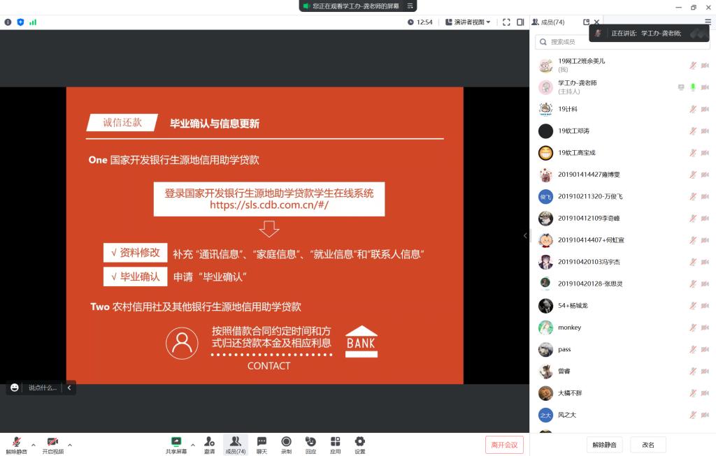通过“诚信还贷”宣讲会,向同学们介绍了有关国家助学贷款的事宜,通过介绍让更多的同学知道了国家对高校学生的支持和鼓励,并强调了诚信贷款与诚信还款内容,加强了同学们诚信和感恩的意识,培养爱国情怀。