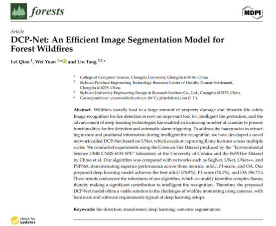 2023级研究生乔磊在国际期刊《Forests》(中科院二区)发表了标题为“DCP-Net: An Efficient Image Segmentation Model for Forest Wildfires”的论文。该论文以成都大学为第一完成单位,2023级研究生乔磊为第一作者,其导师袁伟为通讯作者。