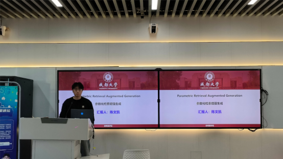 陈文凯同学以“Parametric Retrieval Augmented Generation”为题,介绍了一种新的RAG范式-参数化检索增强生成。该技术通过将外部知识直接编码到大语言模型(LLM)的前馈网络参数中,彻底改变了传统检索增强生成(RAG)的运作模式,为知识密集型任务提供了更高效、更深入的解决方案。