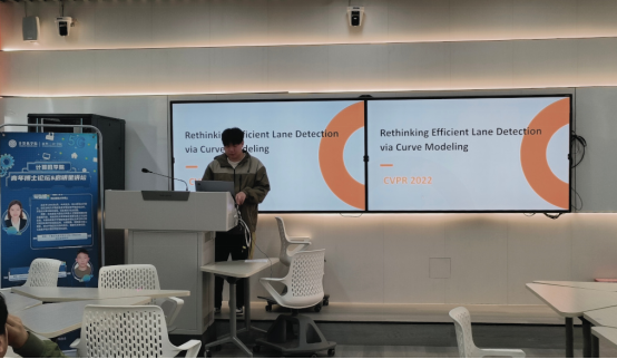 胡乃轩同学则以“Rethinking Efficient Lane Detection via Curve Modeling”为题,介绍了BezierLaneNet模型,其通过端到端的三次Bézier曲线建模重新定义了高效车道检测技术路径。该模型摒弃传统锚点设计和非极大值抑制(NMS)流程,直接预测曲线控制点实现车道线的整体表征,显著简化推理流程。其实现通过引入可变形卷积的特征翻转融合模块,有效利用车道线的左右对称性,在参数量小于10M的轻量化条件下,实现超过150 FPS的实时推理速度。